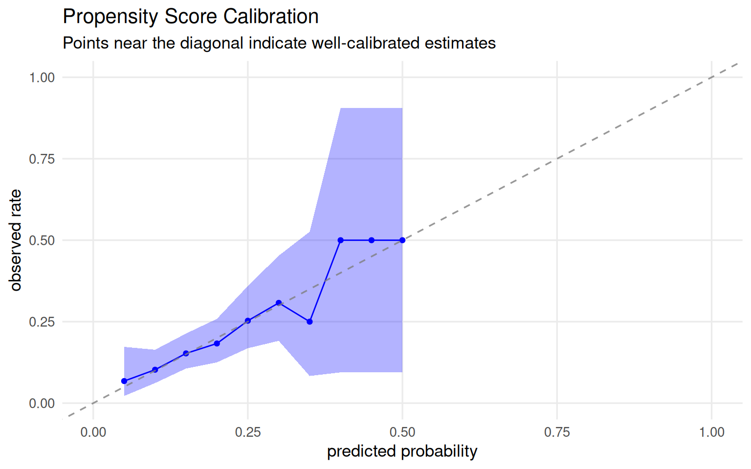 plot_model_calibration(ps_mod, method ="windowed") +theme_minimal(base_size =13) +theme(plot.background =element_rect(fill ="white", color =NA),panel.grid.minor =element_blank() ) +labs(title ="Propensity Score Calibration",subtitle ="Points near the diagonal indicate well-calibrated estimates" )
