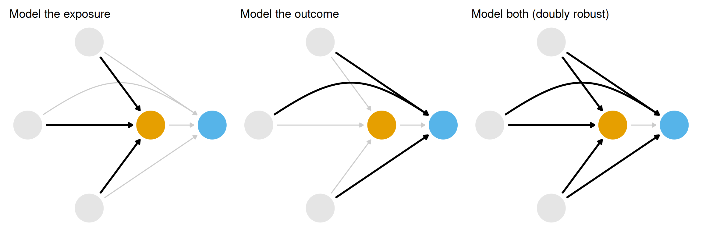 p1 <- dag_plot +geom_dag_edges_arc(curvature =c(rep(0, 5), .3, 0), edge_color ="grey80") +geom_dag_edges_arc(data = \(.x) filter(.x, to =="x"),curvature =c(0, 0, 0),edge_width =1.1 ) +labs(title ="Model the exposure")p2 <- dag_plot +geom_dag_edges_arc(curvature =c(rep(0, 5), .3, 0), edge_color ="grey80") +geom_dag_edges_arc(data = \(.x) filter(.x, name !="x", to =="y"),curvature =c(0, 0, .3),edge_width =1.1 ) +labs(title ="Model the outcome")p3 <- dag_plot +geom_dag_edges_link(data = \(.x) filter(.x, name =="x", to =="y"),edge_color ="grey80" ) +geom_dag_edges_arc(data = \(.x) filter(.x, name !="x"),curvature =c(rep(0, 5), .3),edge_width =1.1 ) +labs(title ="Model both (doubly robust)")p1 + p2 + p3
