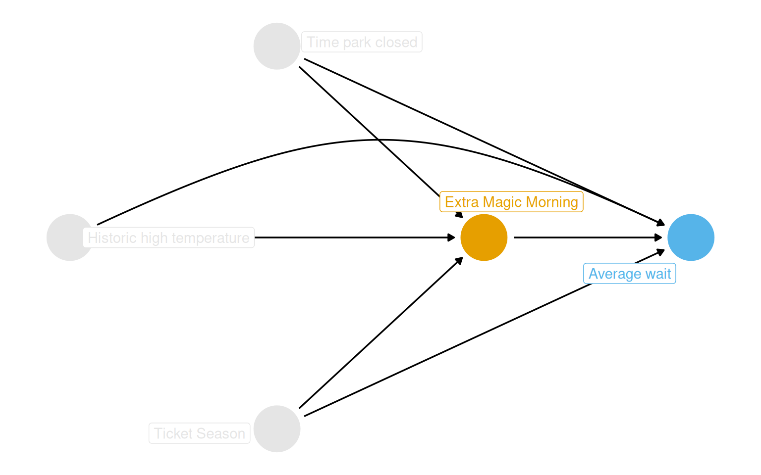 coord_dag <-list(x =c(Season =0, close =0, weather =-1, x =1, y =2),y =c(Season =-1, close =1, weather =0, x =0, y =0))labels <-c(x ="Extra Magic Morning",y ="Average wait",Season ="Ticket Season",weather ="Historic high temperature",close ="Time park closed")dag <-dagify( y ~ x + close + Season + weather, x ~ weather + close + Season,coords = coord_dag,labels = labels,exposure ="x",outcome ="y") |>tidy_dagitty() |>node_status()dag_plot <- dag |>ggplot(aes(x, y, xend = xend, yend = yend, color = status)) +geom_dag_point() +scale_color_okabe_ito(na.value ="grey90") +theme_dag() +theme(legend.position ="none",plot.background =element_rect(fill ="white", color =NA) ) +coord_cartesian(clip ="off")dag_plot +geom_dag_edges_arc(curvature =c(rep(0, 5), .3, 0)) +geom_dag_label_repel(aes(label = label), seed =1630)