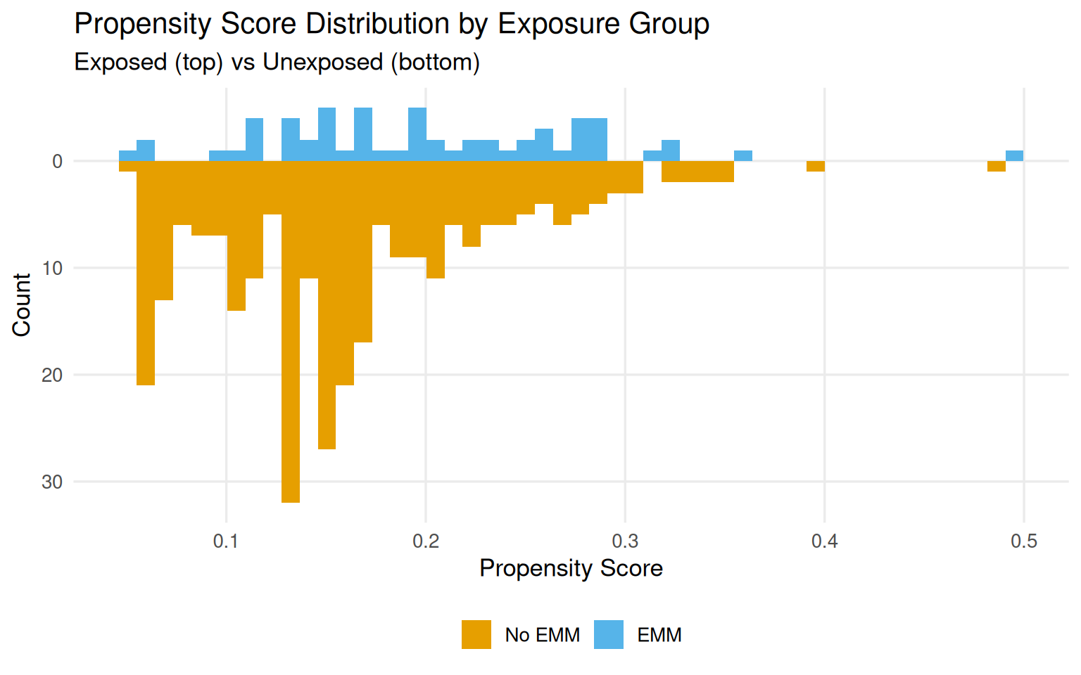 ggplot( seven_dwarfs_9_with_ps,aes(.fitted, fill =factor(park_extra_magic_morning))) +geom_mirror_histogram(bins =50) +scale_y_continuous(labels = abs) +scale_fill_okabe_ito(labels =c("No EMM", "EMM")) +theme_minimal(base_size =13) +theme(legend.position ="bottom",plot.background =element_rect(fill ="white", color =NA),panel.grid.minor =element_blank() ) +labs(x ="Propensity Score",y ="Count",fill =NULL,title ="Propensity Score Distribution by Exposure Group",subtitle ="Exposed (top) vs Unexposed (bottom)" )
