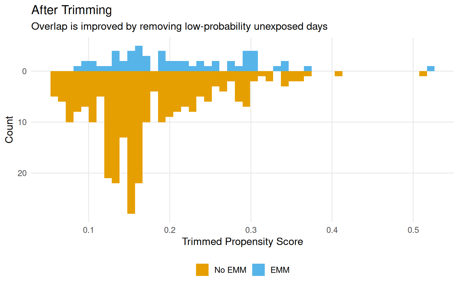 ggplot( seven_dwarfs_9_with_wt,aes(trimmed_ps, fill =factor(park_extra_magic_morning))) +geom_mirror_histogram(bins =50) +scale_y_continuous(labels = abs) +scale_fill_okabe_ito(labels =c("No EMM", "EMM")) +theme_minimal(base_size =13) +theme(legend.position ="bottom",plot.background =element_rect(fill ="white", color =NA),panel.grid.minor =element_blank() ) +labs(x ="Trimmed Propensity Score",y ="Count",fill =NULL,title ="After Trimming",subtitle ="Overlap is improved by removing low-probability unexposed days" )