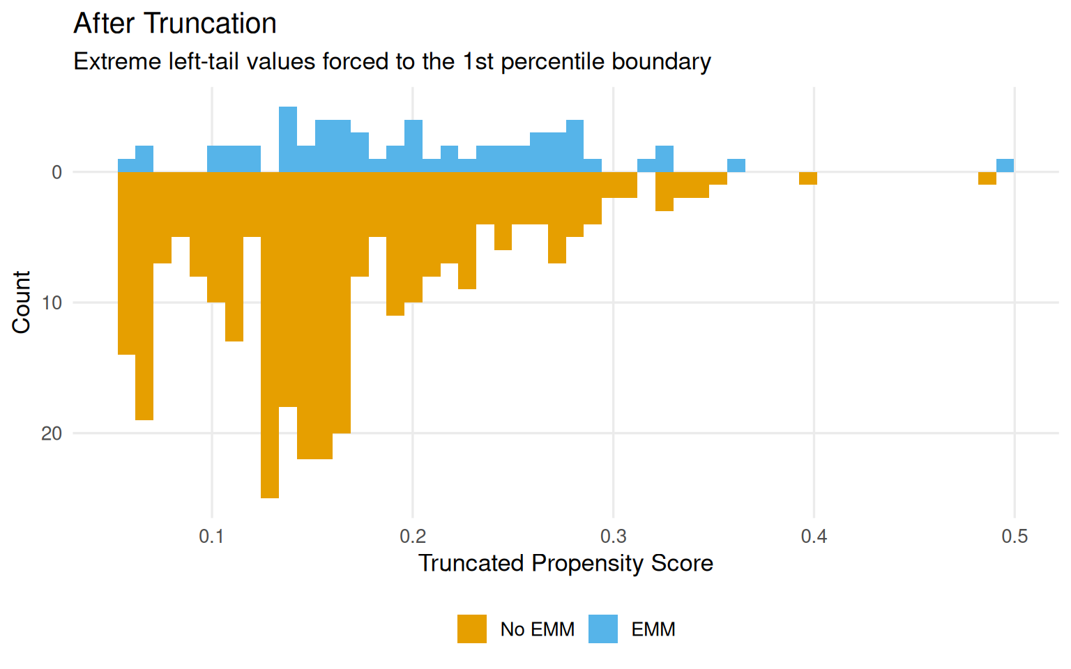 Figure 9.10: Propensity score distributions after truncation to the 1st percentile. No observations are removed, but extreme values are forced to the boundary.