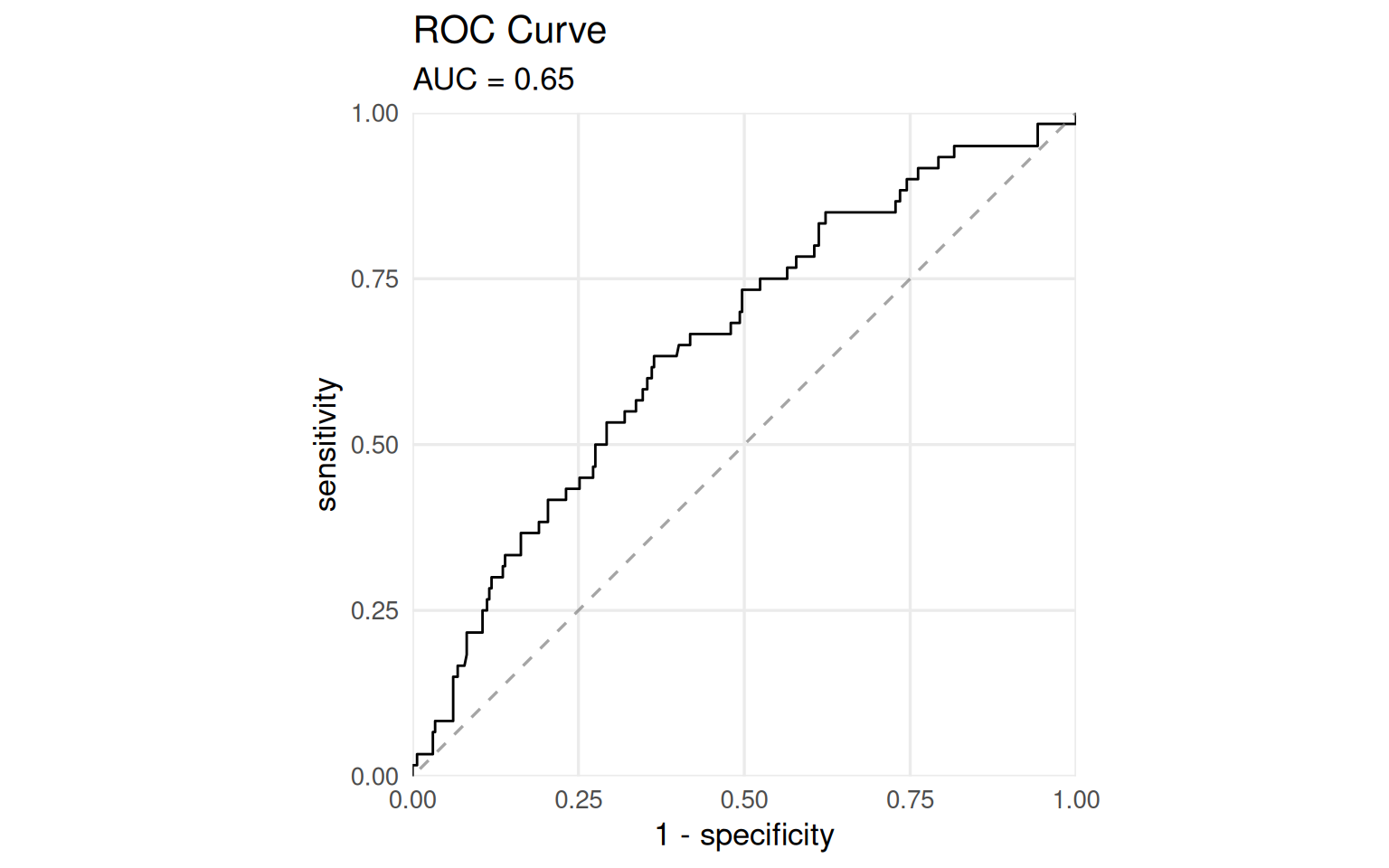 Figure 9.4: ROC curve for the propensity score model. AUC = 0.65, in the range that suggests useful confounding signal without severe positivity concerns.