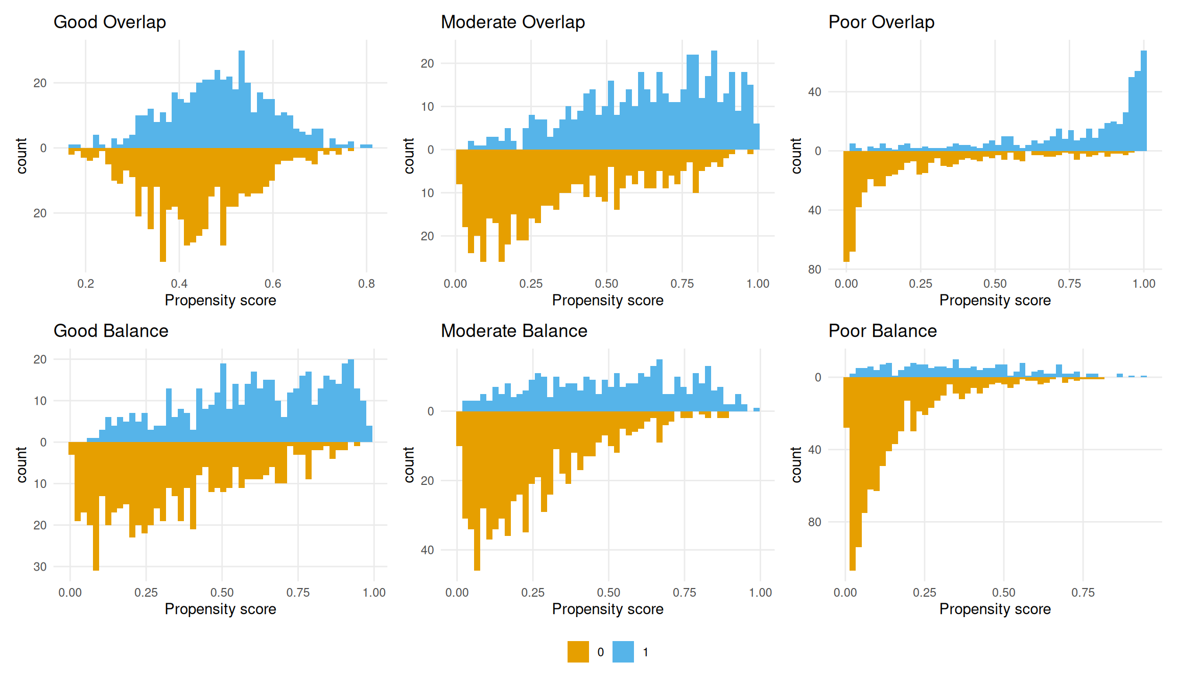 Figure 9.6 shows simulated examples of good, moderate, and poor overlap and balance. These serve as a reference for judging what the actual data look like.