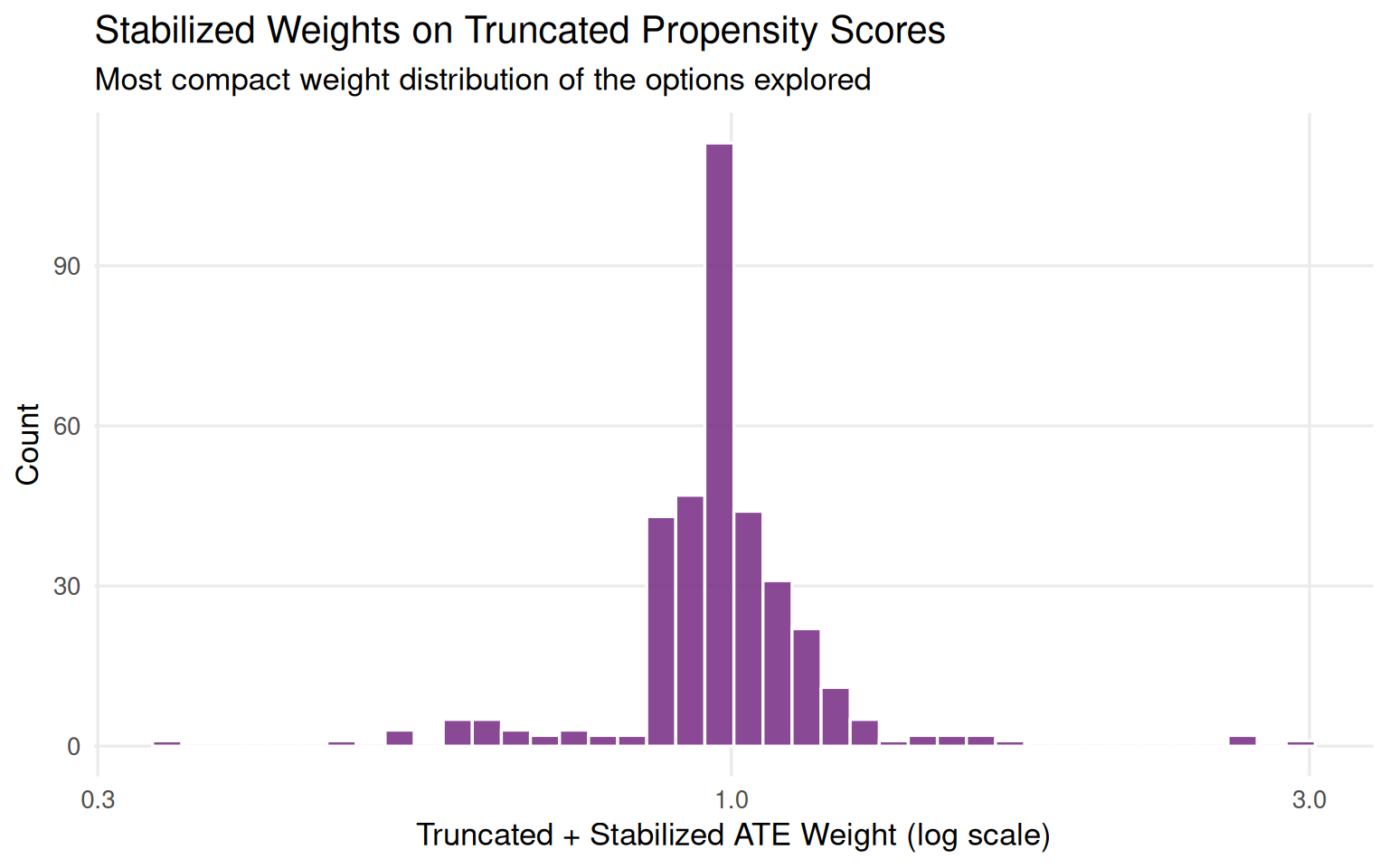 seven_dwarfs_9_with_wt <- seven_dwarfs_9_with_wt |>mutate(trunc_stbl_wt =wt_ate( trunc_ps, park_extra_magic_morning,stabilize =TRUE ))seven_dwarfs_9_with_wt |>ggplot(aes(trunc_stbl_wt)) +geom_histogram(bins =40, fill ="#762a83", color ="white", alpha =0.85) +scale_x_log10() +theme_minimal(base_size =13) +theme(plot.background =element_rect(fill ="white", color =NA),panel.grid.minor =element_blank() ) +labs(x ="Truncated + Stabilized ATE Weight (log scale)",y ="Count",title ="Stabilized Weights on Truncated Propensity Scores",subtitle ="Most compact weight distribution of the options explored" )