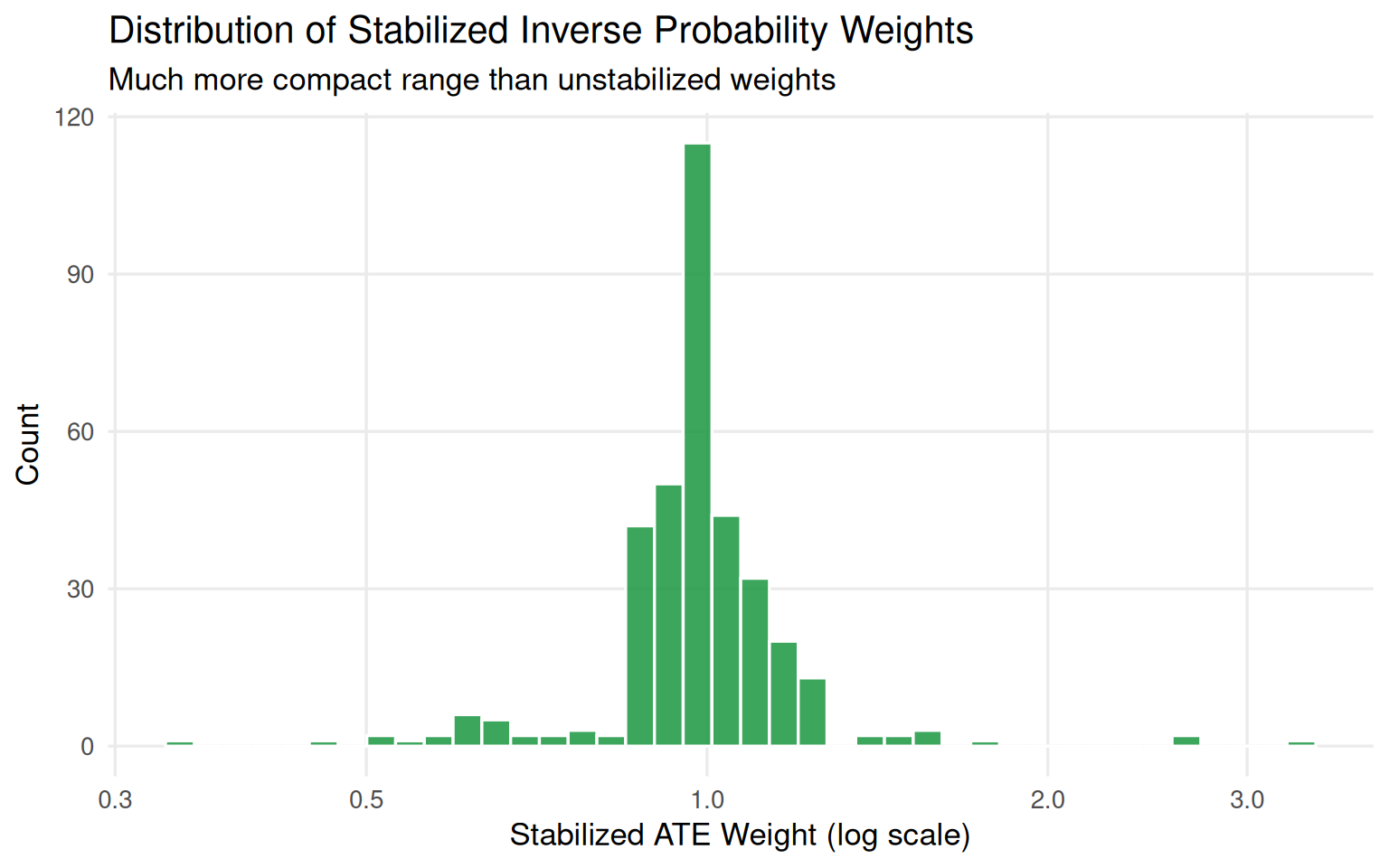 seven_dwarfs_9_with_wt |>ggplot(aes(stbl_wts)) +geom_histogram(bins =40, fill ="#1a9641", color ="white", alpha =0.85) +scale_x_log10(breaks =c(0.3, 0.5, 1, 2, 3)) +theme_minimal(base_size =13) +theme(plot.background =element_rect(fill ="white", color =NA),panel.grid.minor =element_blank() ) +labs(x ="Stabilized ATE Weight (log scale)",y ="Count",title ="Distribution of Stabilized Inverse Probability Weights",subtitle ="Much more compact range than unstabilized weights" )