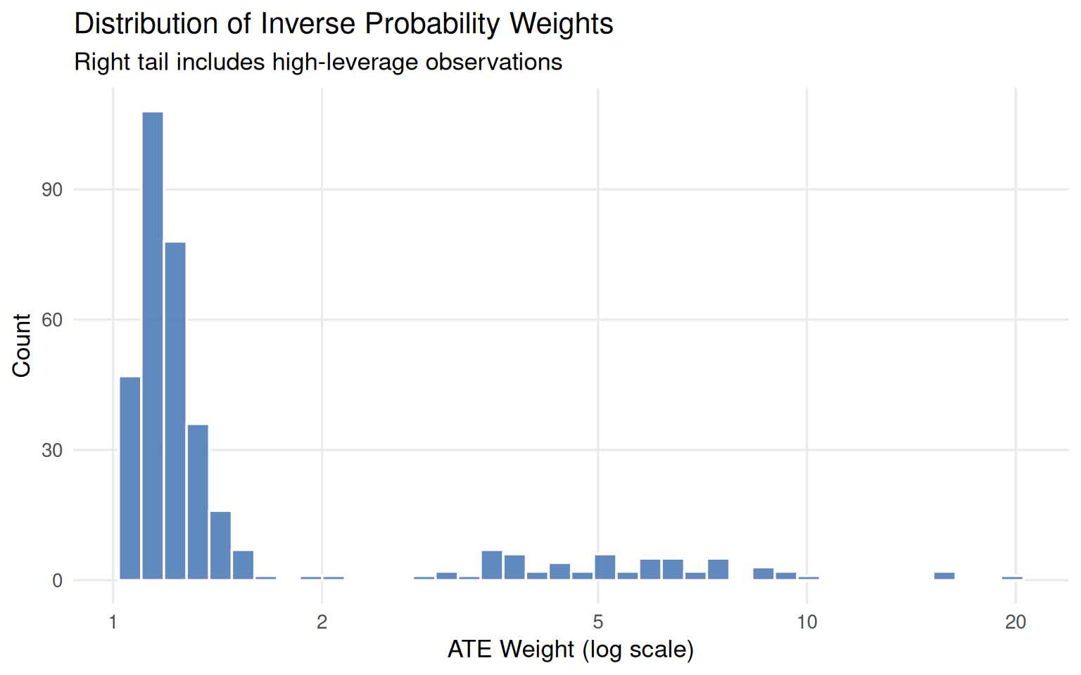 seven_dwarfs_9_with_wt |>ggplot(aes(as.numeric(w_ate))) +geom_histogram(bins =40, fill ="#4575b4", color ="white", alpha =0.85) +scale_x_log10(breaks =c(1, 2, 5, 10, 20)) +theme_minimal(base_size =13) +theme(plot.background =element_rect(fill ="white", color =NA),panel.grid.minor =element_blank() ) +labs(x ="ATE Weight (log scale)",y ="Count",title ="Distribution of Inverse Probability Weights",subtitle ="Right tail includes high-leverage observations" )
