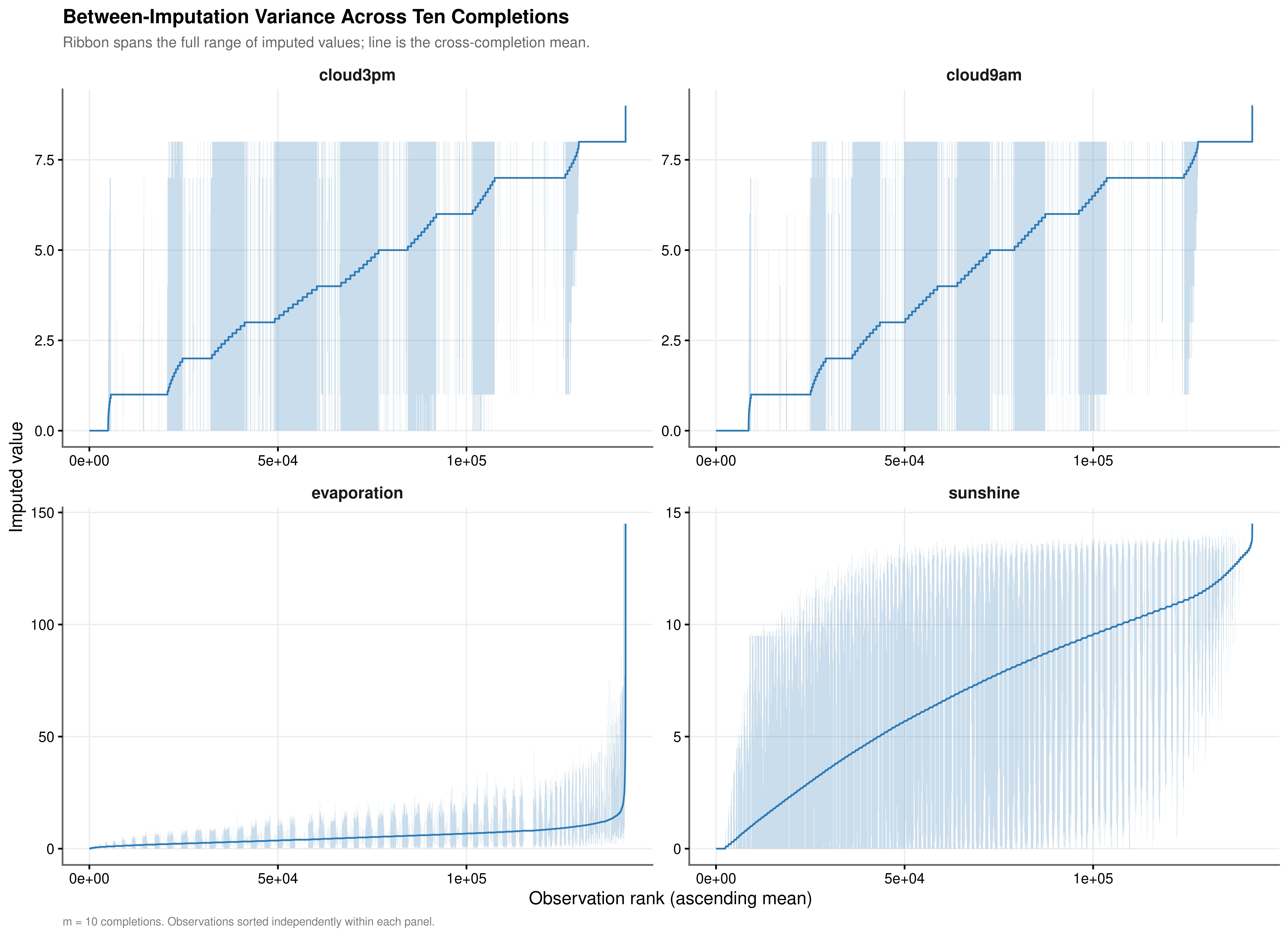sunshine and evaporation show a different structure. Their mean ranges (3.470 and 3.201 respectively) are smaller in absolute terms than the cloud cover ranges, but their CV of Range values (1.172 and 1.721) indicate that imputation uncertainty is not spread uniformly across the distribution: the ribbons are narrow across the bulk of observations but widen substantially in the right tail, where high-sunshine and high-evaporation events are rarer and the PMM donor pool is consequently thinner. For any given high-evaporation day, the spread between the most and least optimistic imputed values across the ten completions is disproportionately large relative to the average. This right-tail concentration of uncertainty is precisely the regime where downstream model coefficients are most sensitive to the choice of completion, making pooled inference particularly important for these two variables.