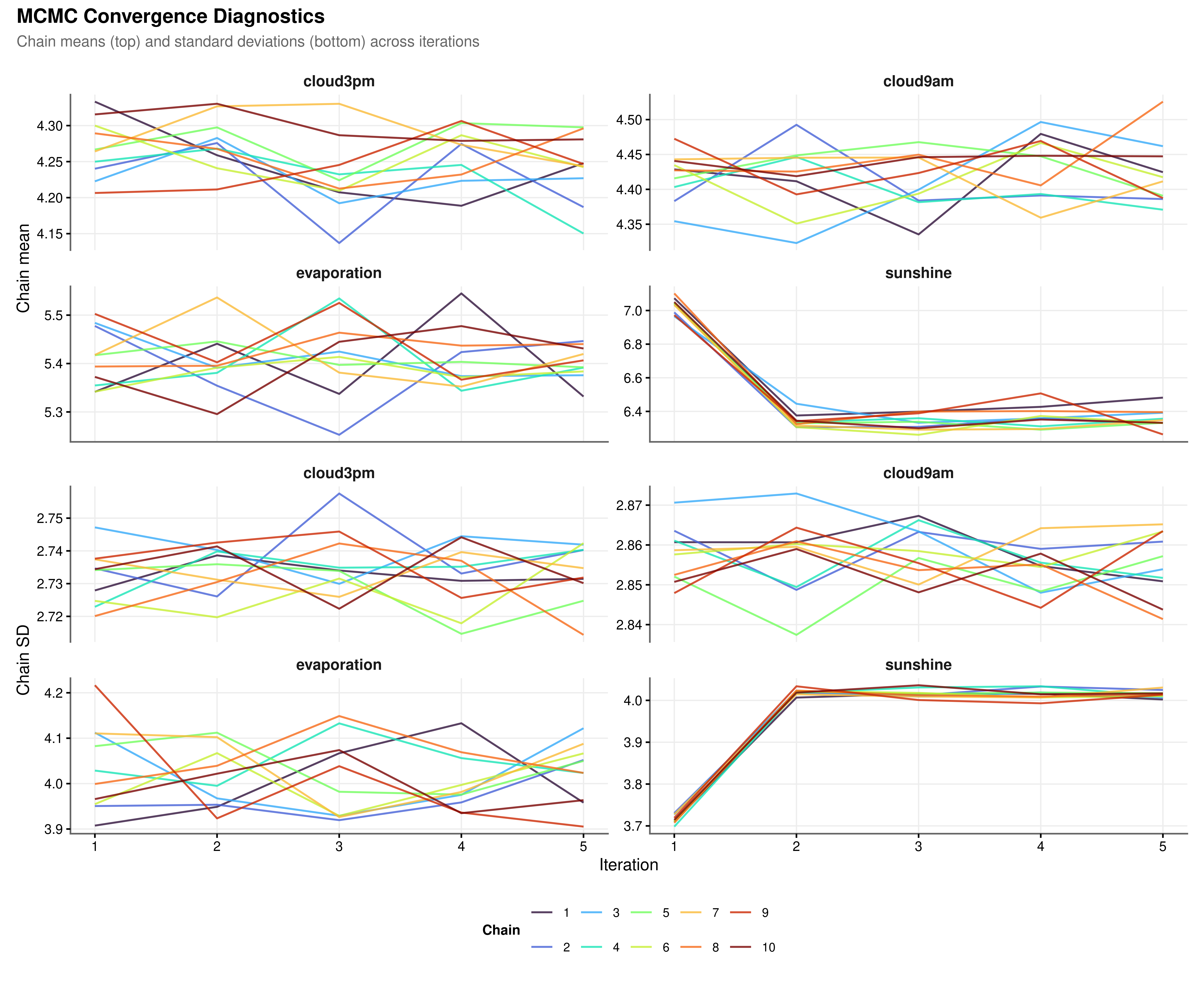 All four variables show satisfactory convergence (Figure 3.1). The chains mix freely throughout and show no directional trend in either the mean or the standard deviation, confirming that five iterations were sufficient for the PMM models to reach a stable solution. The sunshine chains undergo a sharper adjustment between iterations one and two, consistent with the asymmetric bimodal structure of that variable’s observed distribution, but settle into stable mixing immediately afterward. This behaviour is expected: PMM must locate a donor pool within a distribution that has both a low-sunshine cluster and a high-sunshine cluster, and this requires slightly more initial adjustment than the unimodal cloud cover distributions. It is not evidence of non-convergence.