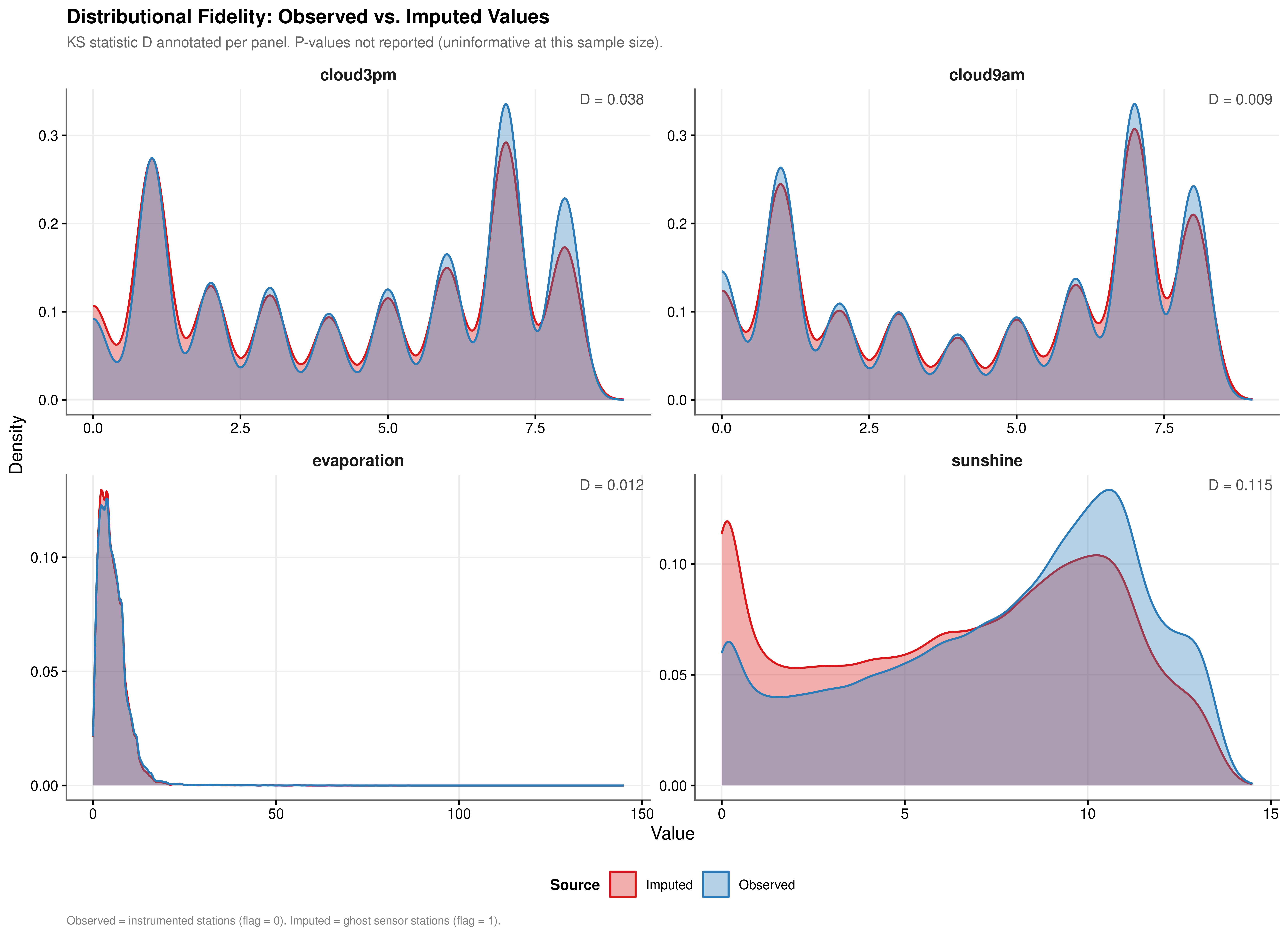 The cloud cover variables achieve near-perfect fidelity (Table 3.1). cloud9am records \(D = 0.009\) and cloud3pm records \(D = 0.038\); both are negligible, and the multi-modal peaks in each cloud cover distribution are reproduced accurately by the imputed draws. evaporation (\(D = 0.012\)) likewise shows a negligible shift. sunshine shows a moderate shift (\(D = 0.115\)), which exceeds the 0.10 threshold and warrants monitoring of sunshine coefficients for sensitivity in downstream models. The shifts for the three lower-fidelity variables are attributable in part to the ghost sensor stations identified in Section 2.2.3: those stations have climatological profiles that differ systematically from the instrumented set, and PMM donor matching correctly reflects those differences rather than suppressing them. All imputed values respect the physical bounds of each variable, a consequence of switching na.approx from rule = 2 to rule = 1 in Stage 1, which eliminated the out-of-range boundary extrapolations that would otherwise contaminate the PMM donor pool.