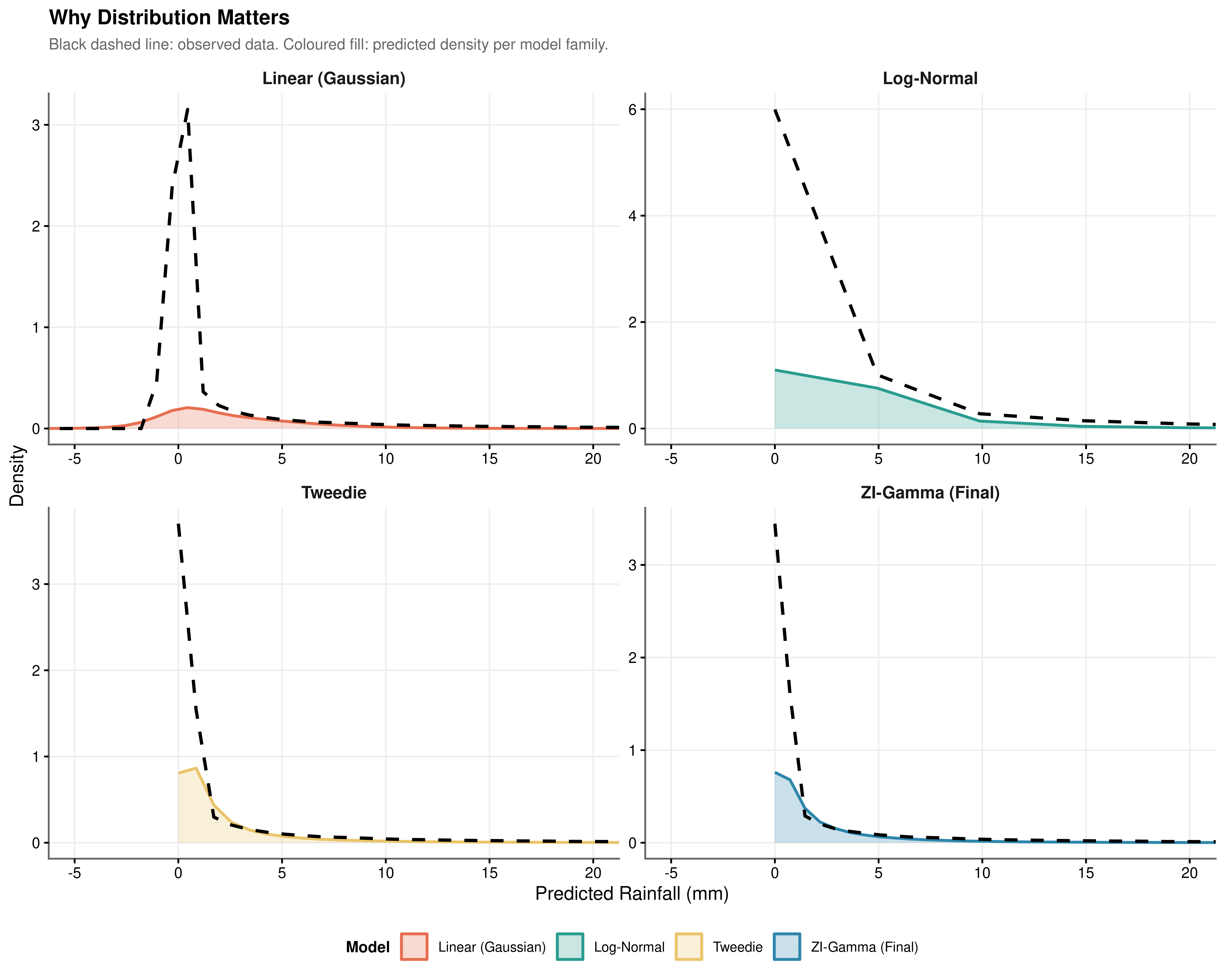 The Gaussian model. A linear mixed model with Gaussian errors generates predictions that extend into negative values. Because the Gaussian distribution has support over the entire real line, the model has no mechanism to prevent this, and negative rainfall is a physical impossibility. The Gaussian assumption also implies a symmetric and constant variance structure, which is incompatible with the heavy right skew and variance-mean dependence documented in Chapter 4. Fitting a Gaussian model to these data produces predictions that are fundamentally inconsistent with the properties of the system being modelled.