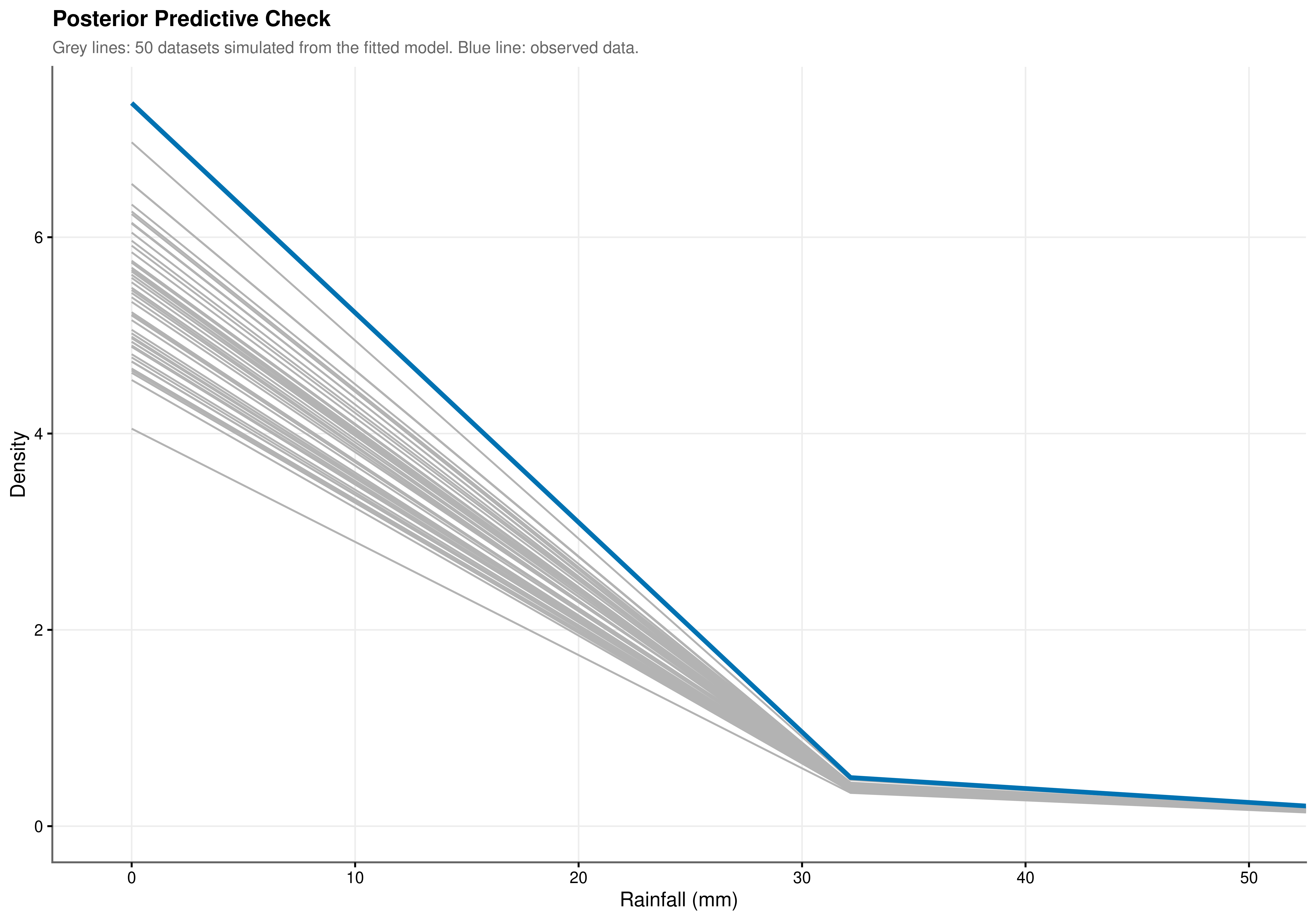Point error metrics measure accuracy at the conditional mean but cannot assess whether the model is correctly reproducing the entire shape of the rainfall distribution. The posterior predictive check (PPC) in Figure 8.1 addresses this more demanding criterion by simulating 50 complete datasets from the fitted model and overlaying their empirical densities against the observed distribution. Close agreement across the full range of the distribution is apparent. The peak at 0 mm is reproduced accurately, confirming that the zero-inflation component is generating the correct proportion of dry-day predictions conditional on all covariates. The decay rate of the right tail follows the observed data closely, a property that a Gaussian model structurally cannot achieve given its symmetric support. The model is not merely fitting conditional means: it replicates the probabilistic structure of the underlying climate system.